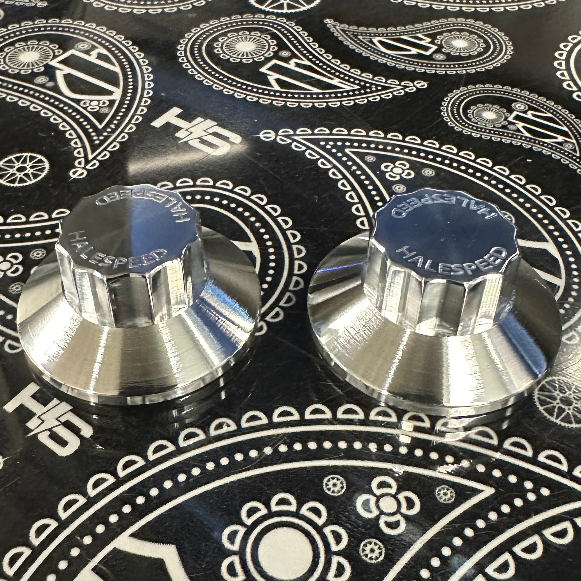 These axle are made from 6061 aluminum and are secured by stainless dual threaded stud that slides through your OEM front axle and take 2 minutes to install filling that nasty opening on your inverted forks. This is verified to fit m8 softail FXLRS and FXLRST models. They come in Raw (extremely easy to polish), Black, Gold & HD factory matched bronze.